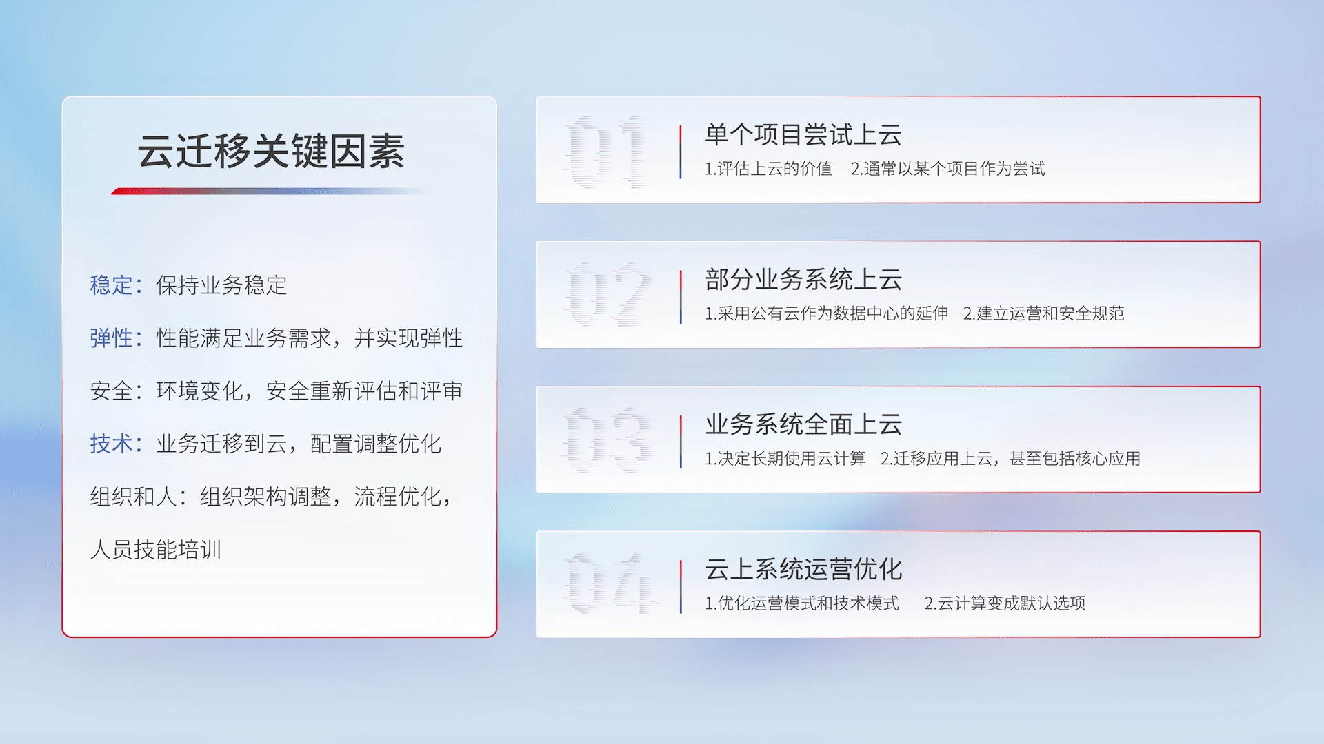 结合实际业务,,从规划设计、、、云平台选型、、云原生改造、、数据迁移、、、、集成交付,,迁移全过程为客户识别最佳上云路径,,,做好风险识别管理,,,设计网络架构、、身份权限、、、、安全审计合规、、、、操作审计、、、、日志审计、、、监控告警策略、、、多站点容灾设计等,,对云上基础设施进行整体规划,,,,提升IT治理水平,,,,以满足弹性、、、高可用、、、、高性能的需求。。。。