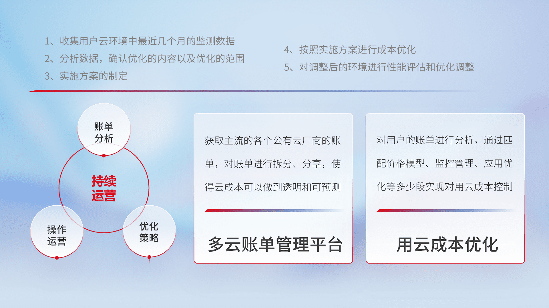 通过多云纳管,,以统一的资源数据模型把客户的云资源进行抽象和封装,,,进而实现对多云资源的统一操作,,保障云资源管理的可靠性、、、稳定性与可用性。。。量身定制化运维内容,,,,配置、、开发运维、、、、补丁管理、、、备份、、监控、、、认证和访问管理、、、、审计和日常巡检等,,,保障在用云过程中的可靠度,,,稳定度以及高可用率。。